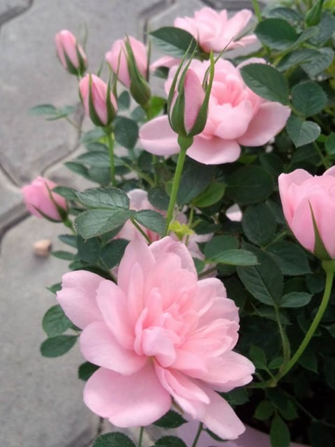 鮮やかな花色の鉢花と組み合わせると、このミニバラピーチ姫は引き立ちますね。