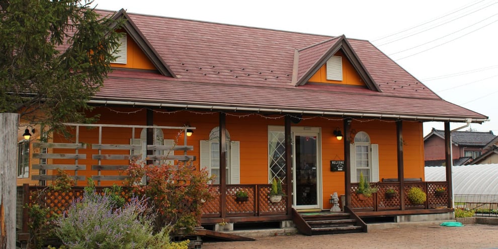 田んぼの真ん中に、大きな三角屋根にオレンジ色の外壁の花香房夢見草が見えます。